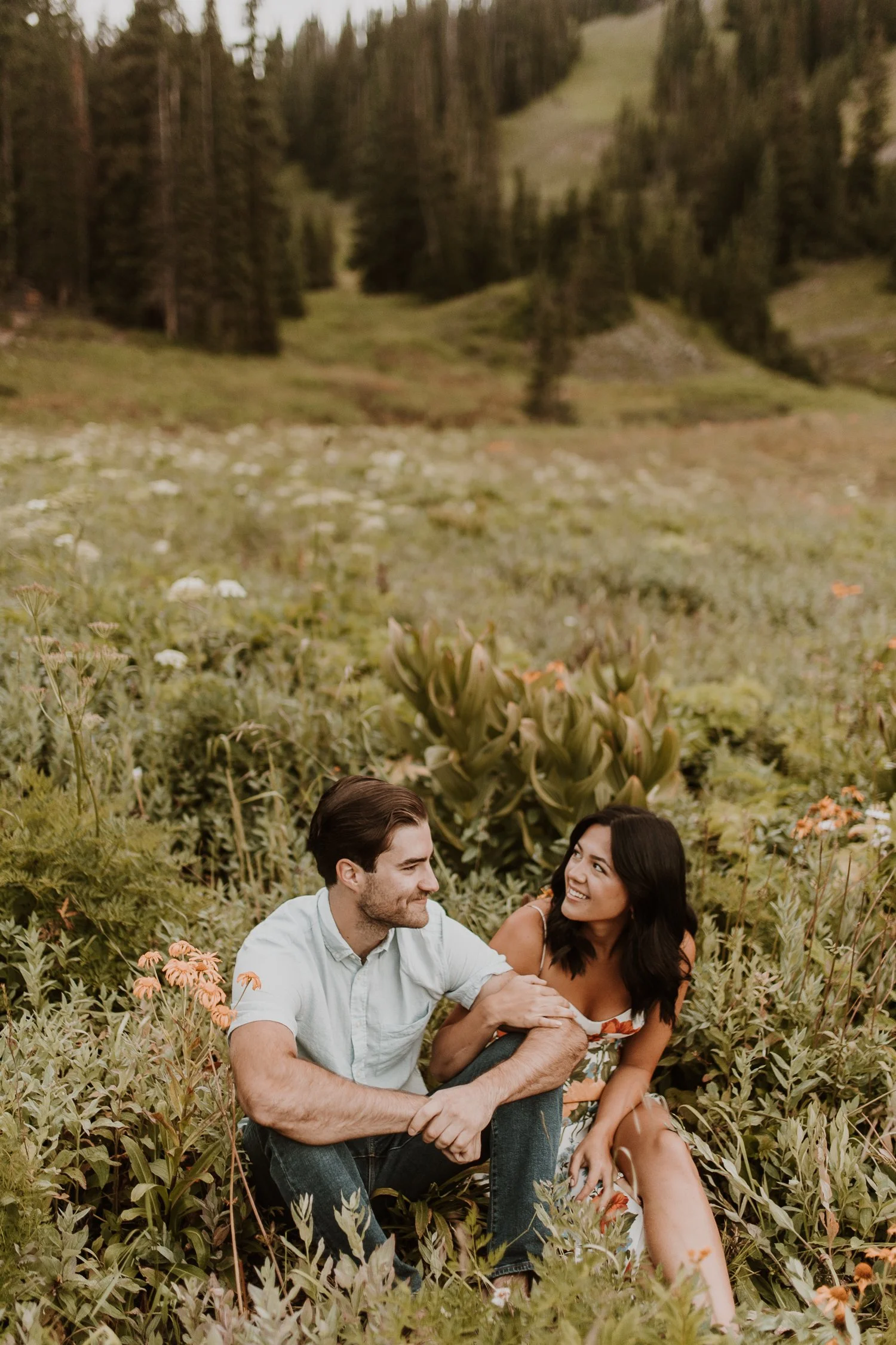 Catherine and Henry met via Tinder and hit it off immediately. They built out and lived in a van for 6 months while they traveled the country, and eventually set down roots in Colorado long-term. Henry lived in Colorado Previously, so he's familiar with the state, but Catherine is getting to experience everything the state has to offer for the first time. For their engagements, Catherine wanted to go to Crested Butte, because she'd never been and wanted to see all the wildflowers, and Crested Butte did not disappoint! We woke up at sunrise, and spent the morning driving around the area, stopping to look at blue-green lakes, admire the flowers, and take in the mountain views. If you wanna see an elopement in this same area, you can check it out here.